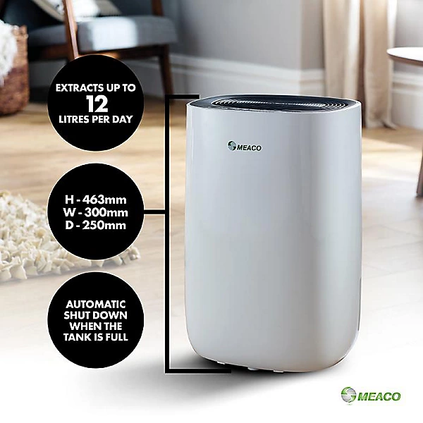 On Meaco’s official page, the ABC 12L is listed at £149.99 and is described as suitable for flats and 1–3 bedroom houses. Meaco states that it extracts 12 litres per day at 30°C and 80% RH, 7.5 litres per day at 27°C and 60% RH, uses a 2.6-litre tank, runs at 36–40 dB(A), and includes a 2-year warranty. Its technical overview also lists a 30%–80% RH humidistat and dimensions of 463 x 300 x 250 mm.
