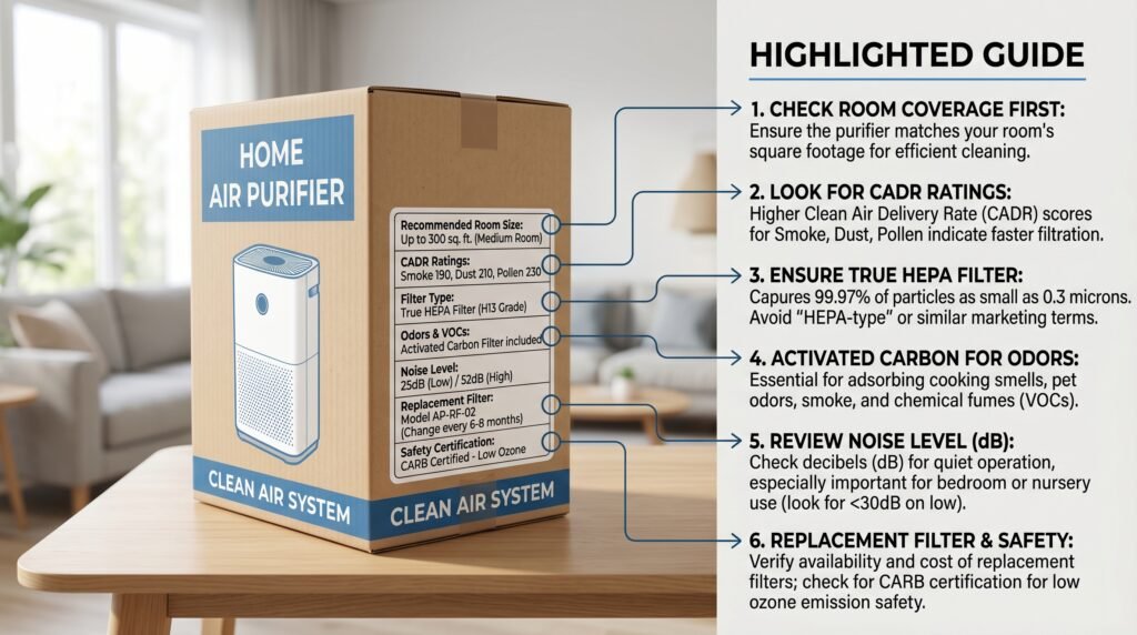 Some air purifiers list one broad room coverage number, while others list separate CADR values for smoke, dust, and pollen. EPA explains that those test categories represent different particle sizes, and the smoke value is the most useful one when you care about very fine airborne particles. That is why two purifiers that claim similar “maximum coverage” can still feel different in real use. A model with a better smoke CADR will usually make more sense for bedrooms and everyday particle control.