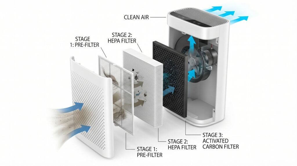 But this is where many air purifier articles become misleading: HEPA is mainly about particles, not gases. If your main complaint is cooking smell, pet odor, or general stale-air odor, a HEPA filter alone is not the full answer. EPA notes that gases and odors are a different problem and usually require activated carbon or another sorbent material.